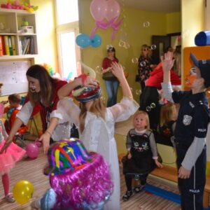 Cała zabawa była bezpieczna ponieważ porządku pilnowało trzech wspaniały policjantów. Ciocie Terapeutki, które w tym dniu również wyglądały jak postacie z bajek przygotowały super gry i pięknie wymalowały buzie naszych milusińskich. Nie zabrakło również baniek mydlanych i różnych animacji.