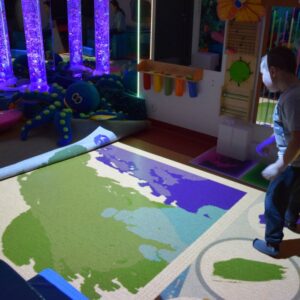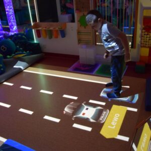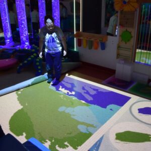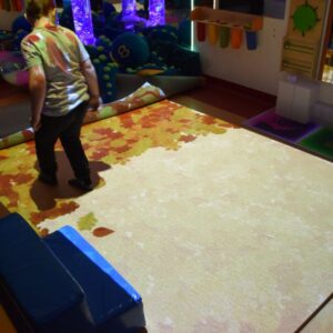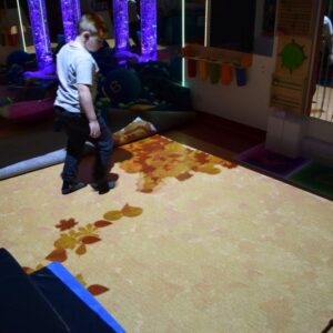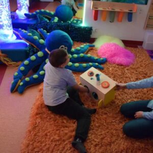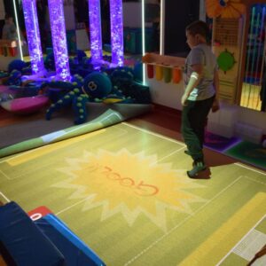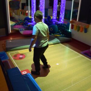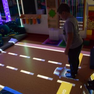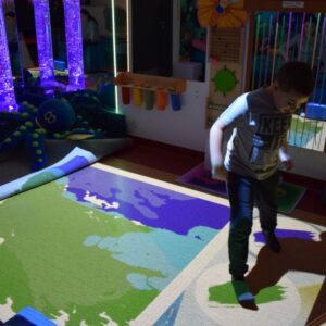 Przestrzeń Sali Doświadczania Świata pozwala również na stymulowanie zmysłu równowagi poprzez rozwijanie orientacji w przestrzeni oraz doświadczanie aktywności i ruchu.