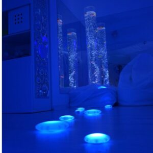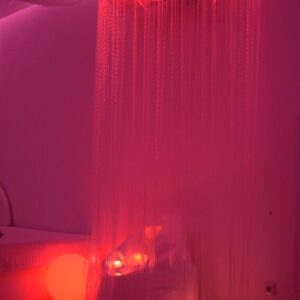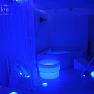 Nowym elementem świetlnym jest półokrągła kurtyna światłowodowa, która jest miejscem gdzie dziecko może schować się i podziwiać relaksujące efekty świetlne. Zabawa światłowodami świetnie wpływa na percepcję wzrokową dzieci. Poza kurtyną świetlną posiadamy także światłowody znajdujące się przy łóżku wodnym oraz przy kolumnach wodnych. Kolejne z elementów Sali, które wykorzystujemy w celu pobudzenia wzrokowego i usprawniania funkcji narządów wzroku to projektory, które pozwalają na projekcję różnorodnych efektów na ścianie lub suficie (sprzyja temu także nowa kolorystyka – wszechobecna biel, na której wyświetlane projekcje są zdecydowanie lepiej widoczne), a także wiele luster – w tym także niewielki lustrzany domek oraz kolorowe tablice ścienne i podświetlane kolumny wodne z wirującymi rybkami.
