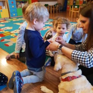 Fundacja AMI w Zduńskiej Woli regularnie odwiedza różne instytucje i placówki oświatowe prowadząc zajęcia z dogoterapii.