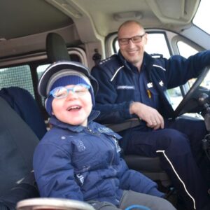 Na koniec dzieciaki mogły obejrzeć radiowóz, zobaczyć migające światełka, usłyszeć syreny policyjne. Dzieci mogły dotknąć, usiąść na fotelu, założyć czapkę, pomachać lizakiem. Dzieciaczkom tak się podobało, że z łzami w oczach opuszczały samochód.