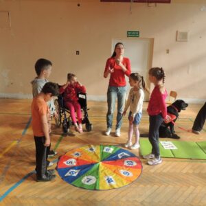 Terapeuci z Fundacji wraz z czworonogami przybliżali w formie zabawy i różnych zadań dzieciom problem niepełnosprawności. Uczyliśmy dzieci tolerancji i umiejętności zachowania się w obecności osób niepełnosprawnych. Dzieci utożsamiały się z osobami niepełnosprawnymi i pokonywały przeszkody. Zobaczyły jak wiele trudu jest potrzebne aby pokonać schody dla osoby na wózku.