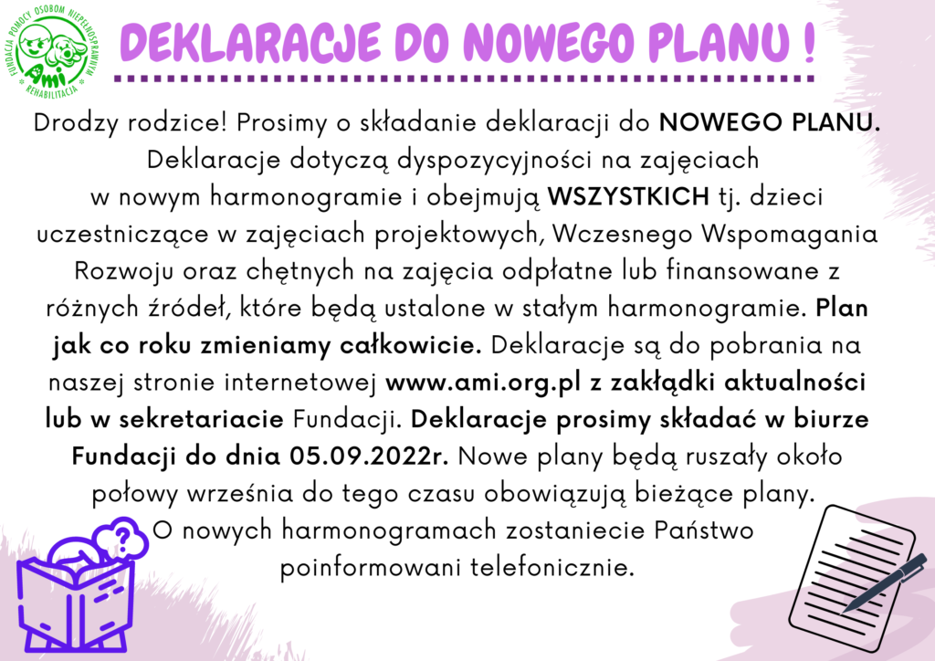 Wypełnione deklaracje można składać osobiście w sekretariacie Fundacji AMI do dnia 05.09.2022 r.
